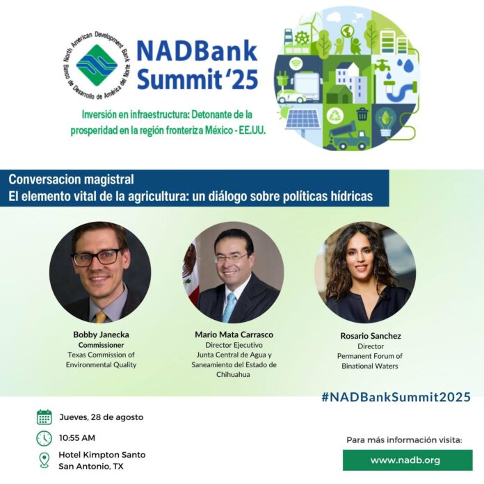 El Gobierno del Estado de Chihuahua, a través de la Junta Central de Agua y Saneamiento (JCAS), participará en la Cumbre del Banco de Desarrollo de América del Norte (NADBank Summit 2025), que se llevará a cabo los días 28 y 29 de agosto en San Antonio, Texas. Este evento es una plataforma clave para discutir temas de infraestructura y sostenibilidad en la región fronteriza entre México y Estados Unidos.