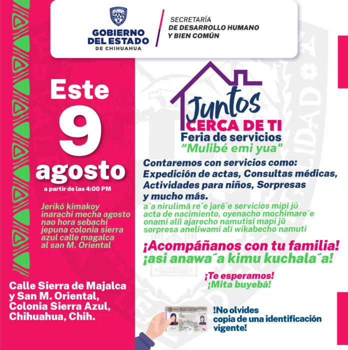 Chihuahua, Chih. (ADN/Staff) – La Secretaría de Desarrollo Humano y Bien Común (SDHyBC) anunció que este viernes 9 de agosto la feria “Juntos Cerca de Ti” llegará a la colonia Sierra Azul, en la ciudad de Chihuahua, con el propósito de brindar servicios gubernamentales a la comunidad.