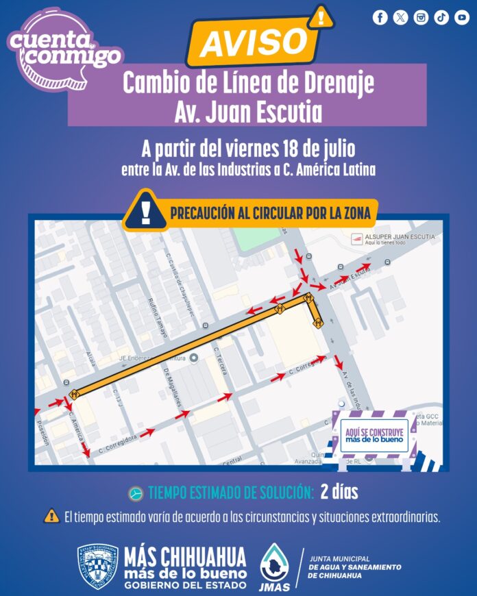 La Junta Municipal de Agua y Saneamiento (JMAS) de Chihuahua ha anunciado que este viernes 18 de julio comenzarán los trabajos de cambio de un tramo de línea de drenaje que se encuentra dañado. Esta obra se llevará a cabo en el cruce de las avenidas Juan Escutia y De las Industrias, un punto clave en la infraestructura vial de la ciudad.