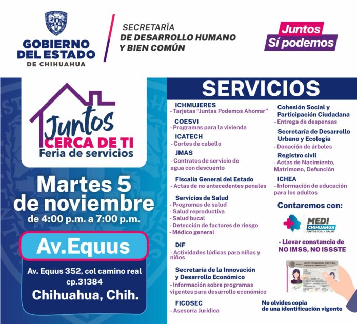 Chihuahua, Chih. (ADN/Staff) – La Secretaría de Desarrollo Humano y Bien Común (SDHyBC) ha convocado a los residentes de la colonia Camino Real a participar en la feria “Juntos cerca de ti”, un evento que promete acercar diversas ofertas de servicios estatales a la comunidad.