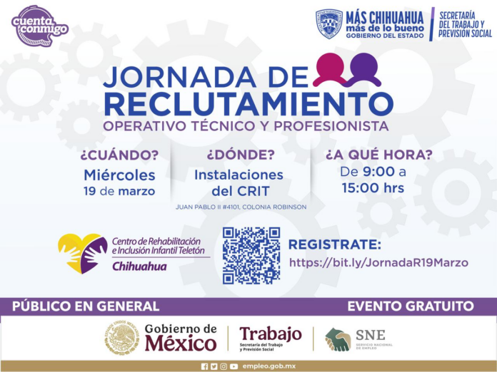 Chihuahua, Chih. (ADN/Staff) – La Secretaría del Trabajo y Previsión Social (STPS) de México, a través del Servicio Estatal de Empleo (SEE), ha programado una Jornada de Reclutamiento que se llevará a cabo el miércoles 19 de marzo en las instalaciones del Centro de Rehabilitación e Inclusión Infantil de Chihuahua (CRIT).