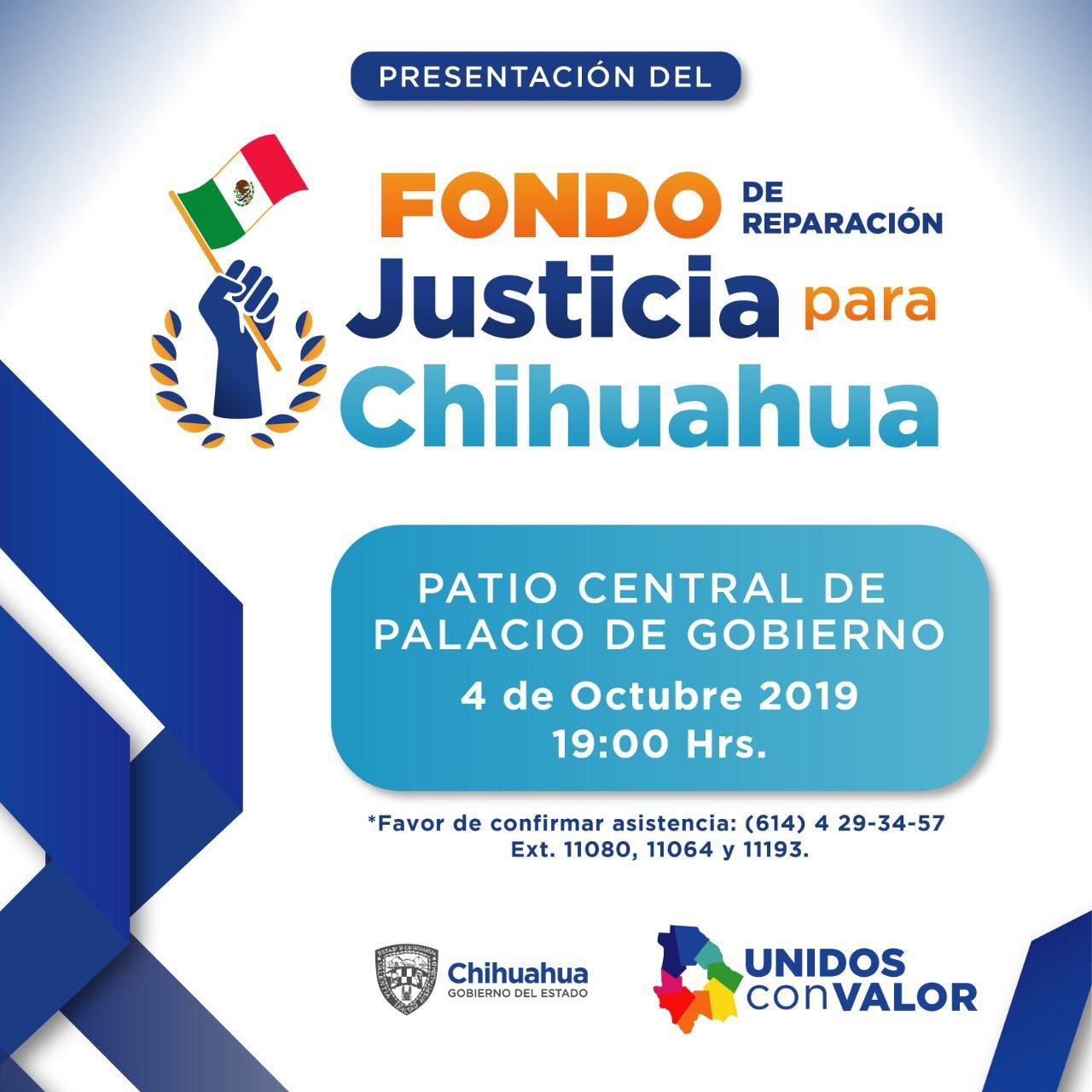 Chihuahua, Chih. – Este 4 de octubre a las 19:00 horas, en el Patio Central del Palacio de Gobierno, el gobernador Javier Corral Jurado, presentará ante líderes y representantes de la sociedad civil las reglas, montos y fuentes de ingreso del Fondo de Reparación Justicia para Chihuahua.