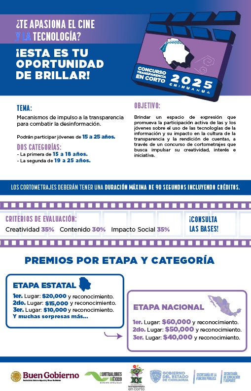 Chihuahua, Chih (ADN/Staff) .- El concurso invita a los participantes a crear un cortometraje de un máximo de 90 segundos que aborde la temática: “Mecanismos de impulso a la transparencia para combatir la desinformación”. Esta iniciativa busca generar conciencia sobre la importancia de la transparencia en la sociedad actual, especialmente en un contexto donde la desinformación puede afectar la percepción pública.