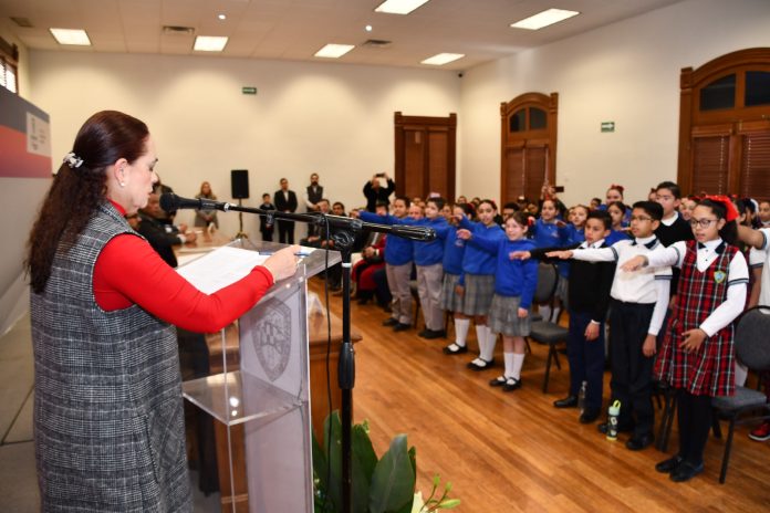 En este marco, la Secretaría de Educación y Deporte (SEyD) llevó a cabo una ceremonia cívica conmemorativa en el Salón Sacramento de Palacio de Gobierno, en la que estudiantes de quinto grado de la Primaria Federal “Miguel Ahumada” y la Primaria Estatal “Porfirio Parra” juraron lealtad a la Carta Magna.