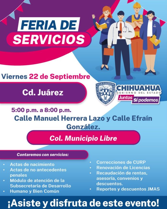 Ciudad Juárez, Chih.- Con el objetivo de acercar diversos trámites del Gobierno del Estado a la comunidad juarense, esta semana la Feria de Servicios llega hasta el interior de la planta industrial “Lear”, además de al Parque Borunda y a las colonias Municipio Libre e Independencia II.