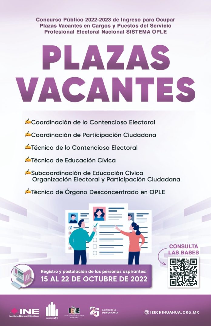 Chihuahua, Chih. (ADN / Martín Orquiz) – Con el objetivo de ocupar plazas en los Organismos Públicos Locales Electorales, entre ellos el Instituto Estatal Electoral (IEE) de Chihuahua, el Instituto Nacional Electoral (INE) México emitió una convocatoria Concurso Público 2022–2023 de ingreso, se informó a través de un comunicado.