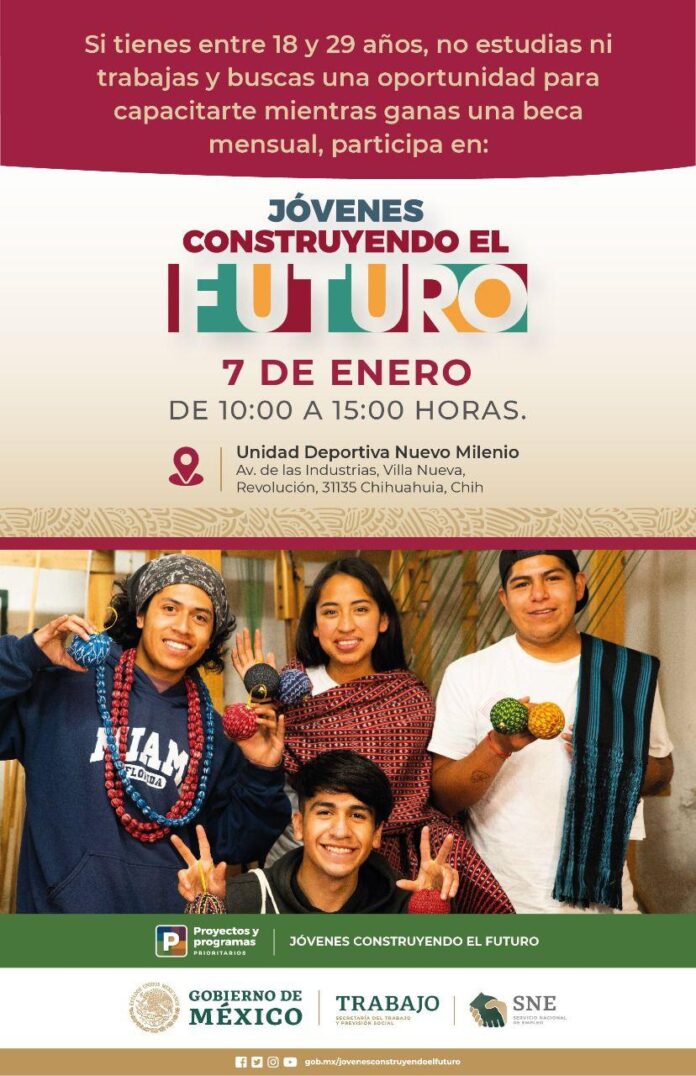 Chihuahua, Chih. (ADN / Martín Orquiz) – A través del Programa Jóvenes Construyendo el Futuro, el Gobierno de México convoca a las y los ciudadanos que tengan entre 18 y 29 años, que no estudian y no trabajan, a que acudan a inscribirse a la oficina móvil que se instalará el viernes 7 de enero en la Deportiva Nuevo Milenio, ubicada en Avenida de las Industrias y Villa Nueva, de la colonia Revolución, en la ciudad de Chihuahua.