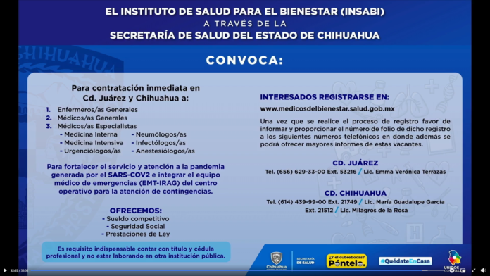 Chihuahua, Chih. – La Secretaría de Salud del Gobierno del Estado de Chihuahua extendió la invitación del Instituto de Salud para el Bienestar (Insabi) al personal de enfermería, médicos generales y especialistas, para contratación inmediata en Juárez y Chihuahua, a fin de fortalecer el servicio y atención a la pandemia generada por el SARS-COV2.