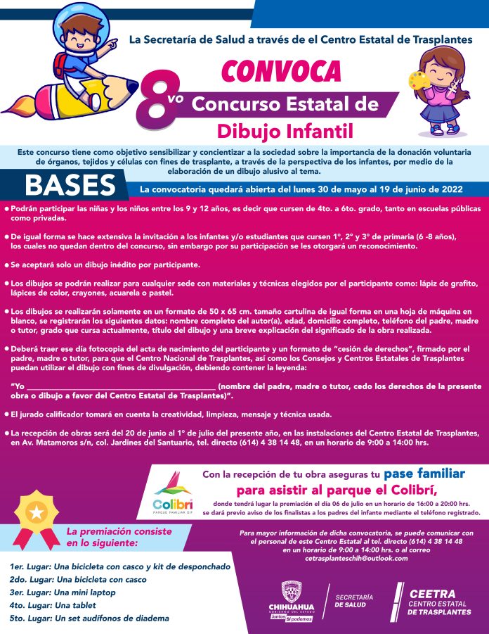 Chihuahua, Chih .- Con el fin de incentivar la cultura de donación de órganos, tejidos y células con fines de trasplante, la Secretaría de Salud del Estado de Chihuahua a través del Centro Estatal de Trasplantes (CEETRA) convoca a niñas y niños entre 9 y 12 años de edad a participar en el 8º Concurso Estatal de Dibujo Infantil.