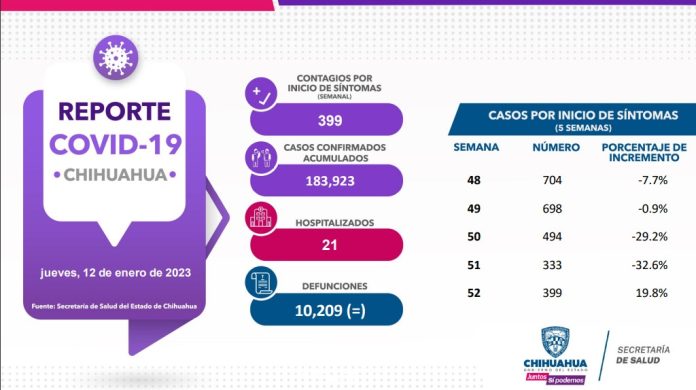El Gobierno del Estado, a través de la Secretaría de Salud de Chihuahua, presenta este 12 de enero el reporte COVID-19, que registra un acumulado de 183 mil 923 (+114) casos confirmados, 399 casos por inicio de síntomas y 21 pacientes hospitalizados.