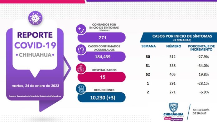 El Gobierno del Estado, a través de la Secretaría de Salud de Chihuahua, presenta este 24 de enero el reporte COVID-19, que registra un acumulado de 184 mil 439 (+172) casos confirmados, 271 casos por inicio de síntomas y 15 pacientes hospitalizados.