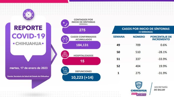 El Gobierno del Estado, a través de la Secretaría de Salud de Chihuahua, presenta este 17 de enero el reporte COVID-19, que registra un acumulado de 184 mil 131 (+208) casos confirmados, 275 casos por inicio de síntomas y 15 pacientes hospitalizados.