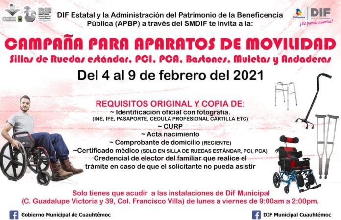Cuauhtémoc, Chih. – Concluido el proceso de registros llevado a cabo en días pasados en la Campaña de Aparatos de Movilidad, el DIF Municipal de Cuauhtémoc en coordinación con el DIF Estatal y la Administración del Patrimonio de la Beneficencia Pública anunció que beneficiará a 47 personas, es decir el 100 por ciento de quienes acudieron a inscribirse.