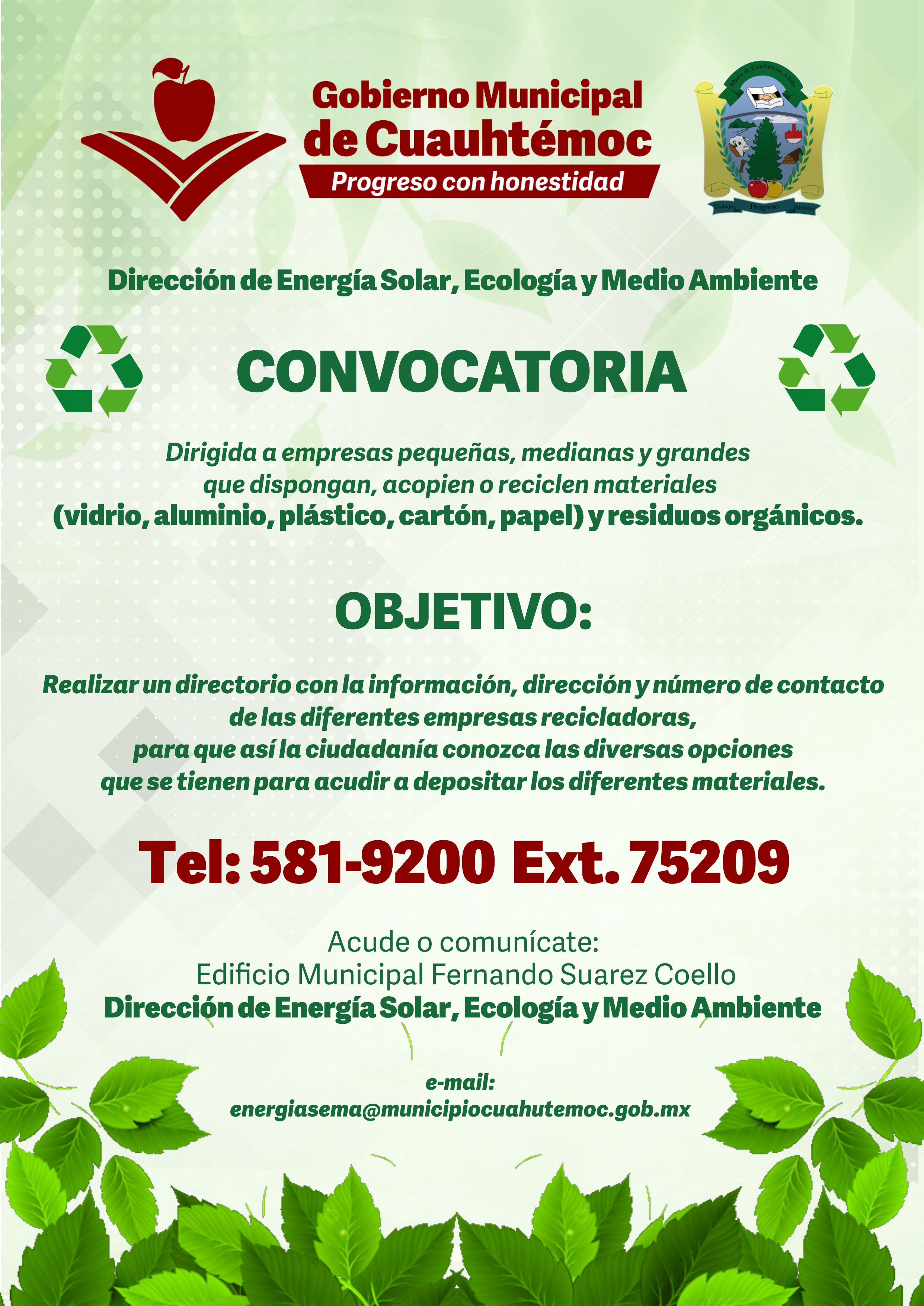 Los interesados en participar en el directorio de información de empresas recicladoras, pueden acudir a la Dirección de Energía Solar Ecología y Medio Ambiente situada en el edificio de Presidencia Fernando Suárez Coello o bien pueden comunicarse al número telefónico 625 581 9200 extensión 75209 o bien a través del correo electrónico [email protected]