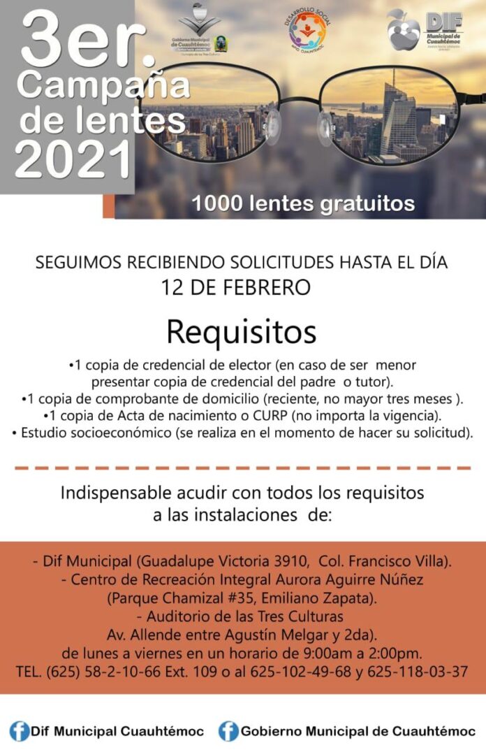 Cuauhtémoc, Chih. – En continuidad a la tercer campaña de lentes 2021, el Gobierno Municipal de Cuauhtémoc a través del DIF habilitó el Auditorio de las Tres Culturas para la recepción de solicitudes, además del punto en las instalaciones del descentralizado, indicó la Directora Monserrate Terán López.