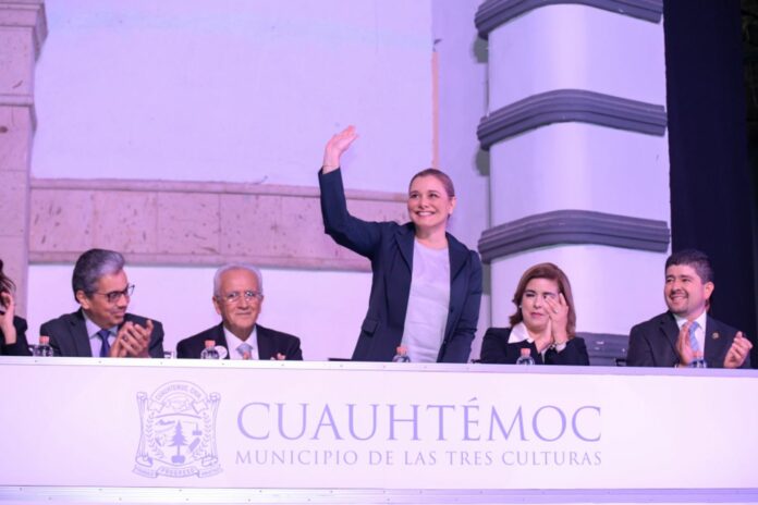 Chihuahua, Chih. (ADN/Staff) – La gobernadora de Chihuahua, Maru Campos, reiteró su compromiso de cuidar del legado construido en Cuauhtémoc durante su mensaje en la toma de protesta del presidente municipal Elías Humberto Pérez Mendoza.