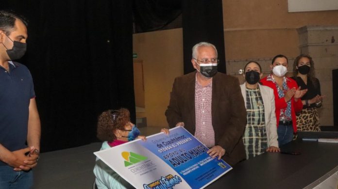 El presidente municipal Beto Pérez entregó de manera simbólica una tarjeta a la señora Rosario Chaparro, quien estuvo en el presídium en representación de todos los beneficiarios que acudieron por sus tarjetas al Auditorio de las Tres Culturas.