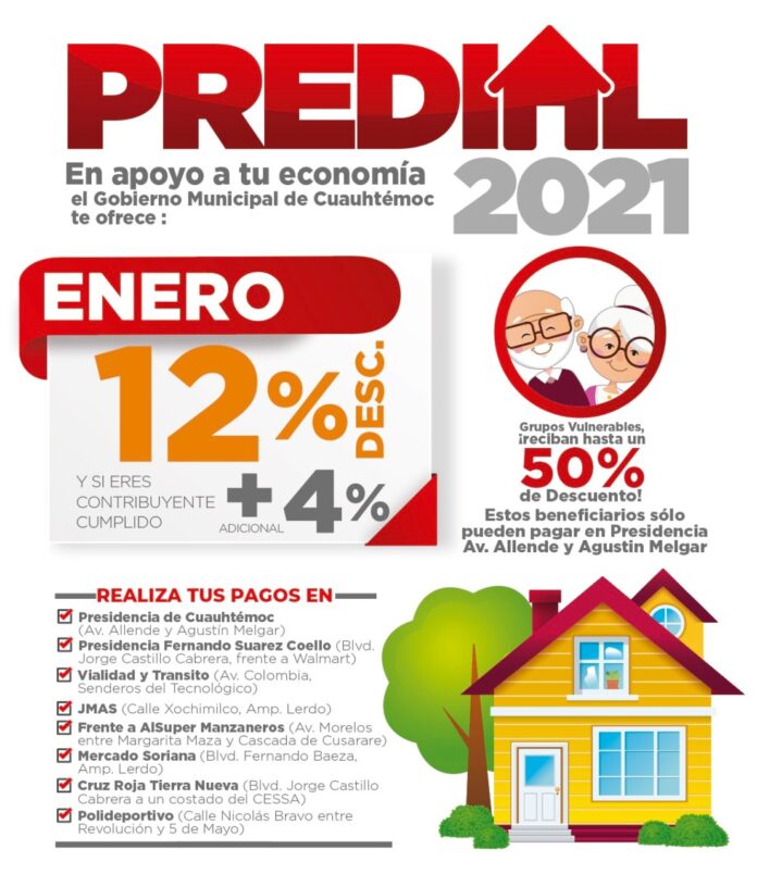 Cuauhtémoc, Chih. – La Dirección de Finanzas del Gobierno Municipal de Cuauhtémoc pidió a la población aprovechar estos diez días restantes del mes de enero para realizar el pago del Impuesto Predial con el mayor descuento del 12 por ciento por pronto pago y 4 por ciento por no adeudo.