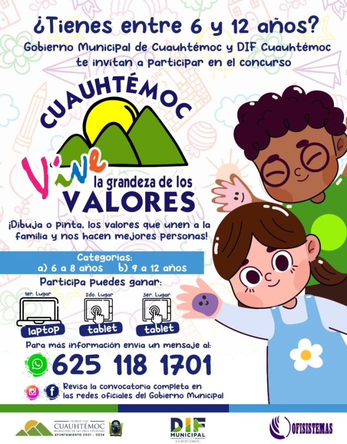 El presidente municipal Beto Pérez invitó a las niñas y los niños de Cuauhtémoc, de entre 6 y 12 años de edad, a participar en el concurso “Cuauhtémoc Vive la Grandeza de los Valores”, donde los participantes dibujarán los valores que unen a la familia y nos hacen mejores personas.