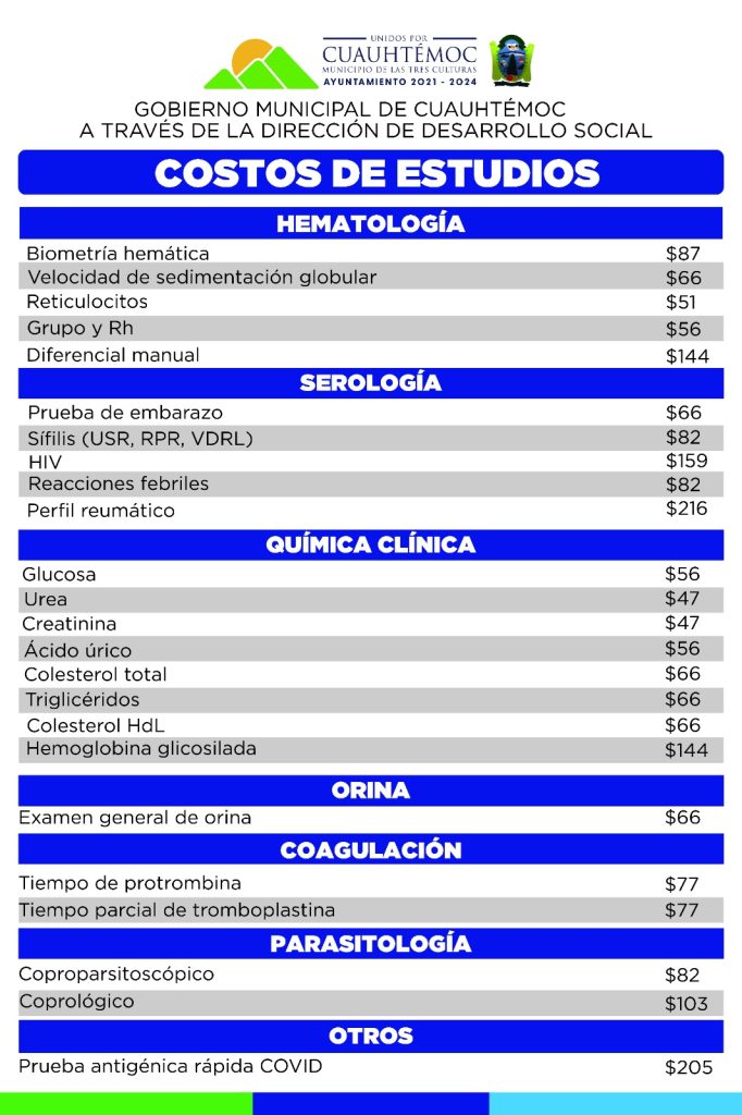 SEROLOGÍAPrueba de embarazo $66Sífilis (USR, RPR, VDRL) $82HIV $159Reacciones febriles $82Perfil reumático $216