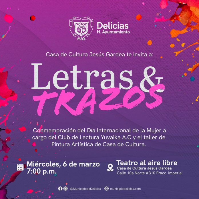 Delicias, Chih. (ADN/Staff) – Este miércoles 6 de marzo, a las 7 de la tarde, el teatro al aire libre de Casa de Cultura, Jesús Gardea, será el escenario del evento gratuito “Letras y Trazos”, en conmemoración del Día Internacional de la Mujer. Una oportunidad única para honrar y destacar el papel de la mujer en la sociedad a través del arte y la literatura.