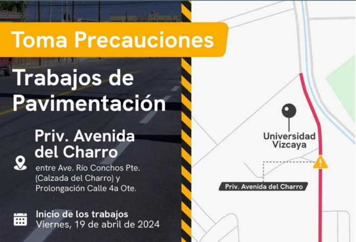 Delicias, Chih. (ADN/Staff) – Este viernes darán inicio los trabajos de rehabilitación en la vialidad Privada Avenida del Charro, ubicada entre la Calzada del Charro y la prolongación de la Calle Cuarta Oriente, frente a la Universidad Vizcaya de las Américas en Delicias. La Dirección de Obras Públicas ha notificado a la universidad para que pueda informar a los estudiantes y tomar las medidas pertinentes al transitar por esa zona.