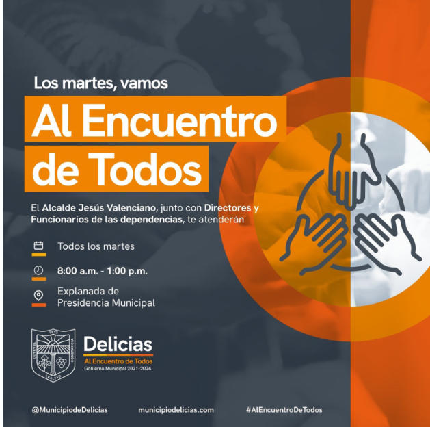 Con el fin de brindar una atención más personalizada con la ciudadanía y resolver las diversas situaciones de manera más rápida, el Gobierno Municipal de Delicias implementará el programa “Al Encuentro de Todos”, que se llevará a cabo cada martes.