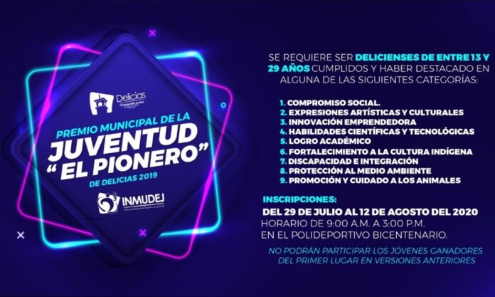 Con el objetivo de reconocer a los jóvenes destacados en diversas áreas del municipio, el Gobierno Municipal de Delicias a través del Instituto Municipal del Deporte y la Juventud, invitan a participar en el Premio Municipal de la Juventud “El Pionero” de Delicias 2019.