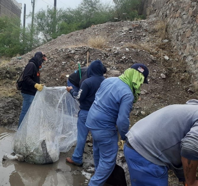 Delicias, Chih. – A la salida del dren pluvial de la colonia Carmen Serdán, una cuadrilla de Servicios Públicos realizó trabajos de limpieza levantando gran cantidad de basura que provocó el taponamiento del dren, asimismo, en la calle Francisco Villa, entre las avenidas Cuarta y Sexta, se abrió el registro para desfogar el agua estancada.