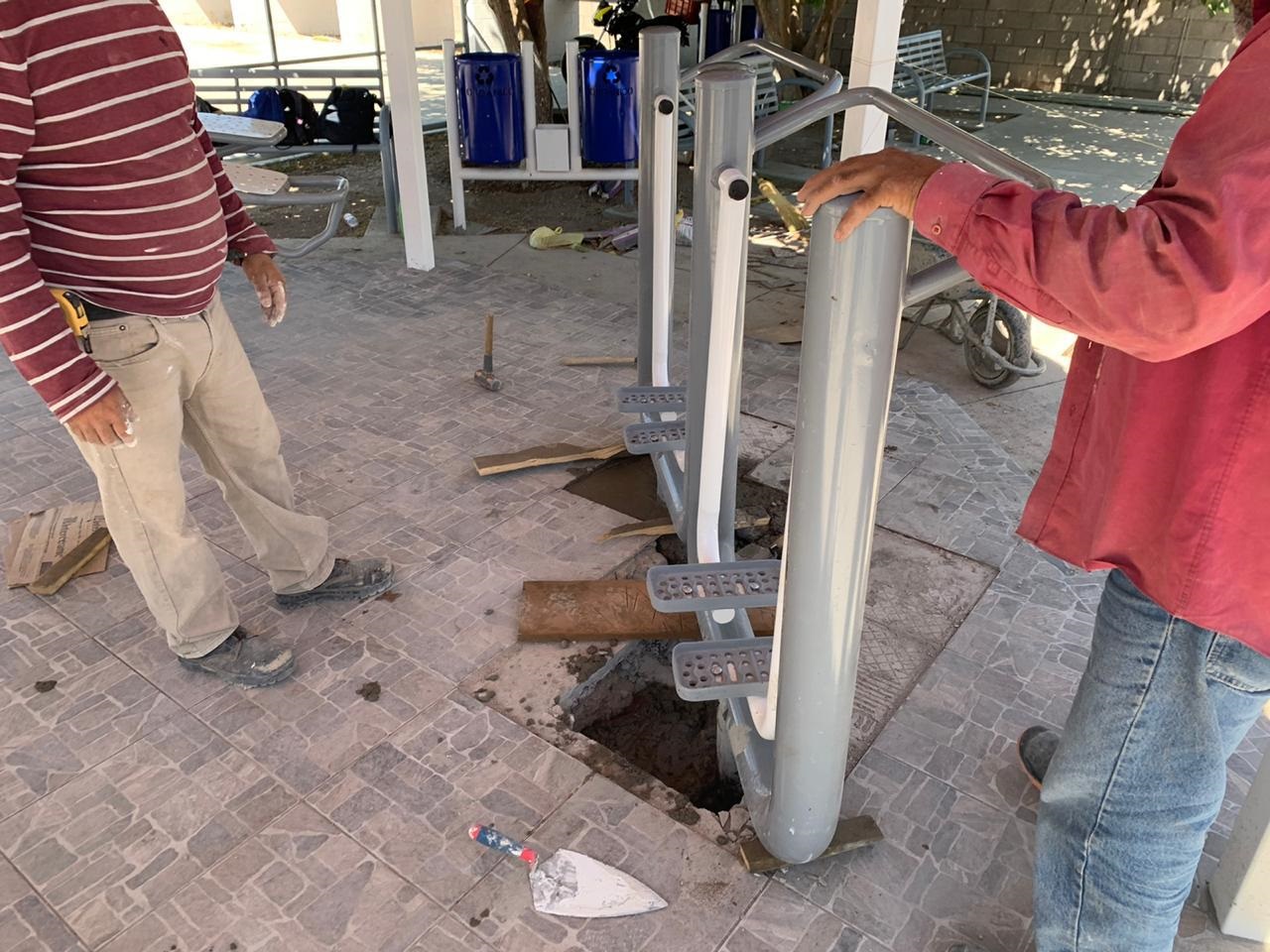 La Dirección de Obras Públicas trabaja en los últimos detalles de colocación de cerámica en bebedero y de aparato de ejercicio doble para entregar en próximos días esta obra a las familias de esta importante colonia.