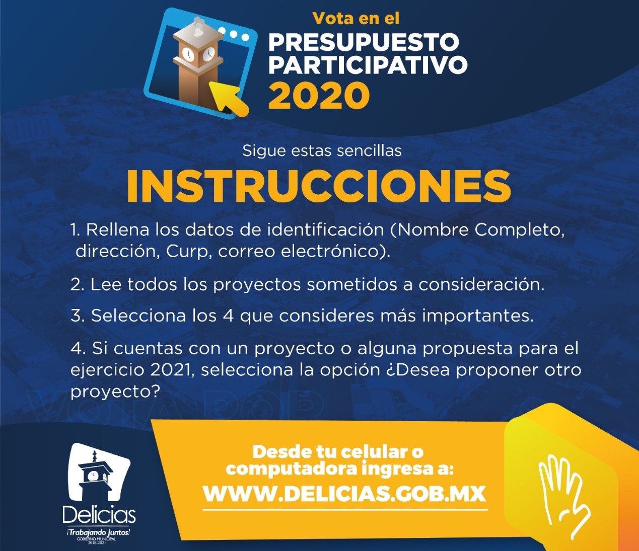 Para votar en el Presupuesto Participativo 2020 es muy sencillo, ingresa a la página web www.delicias.gob.mx y automáticamente te mostrará las siguientes instrucciones a seguir: