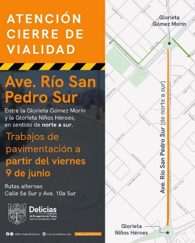 A fin de mantener informada a la ciudadanía, Erick Rodríguez, coordinador de Vialidad, informó que el cierre vial programado en la avenida Río San Pedro Sur, para el lunes 05 de junio se retrasó unos días, hasta el viernes 09 de junio.