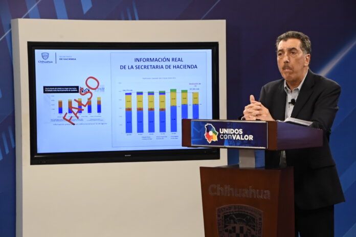 Chihuahua, Chih .- El secretario de Hacienda, Arturo Fuentes Vélez, desmintió una a una las afirmaciones falsas vertidas por los diputados electos Carlos Olson y Luis Aguilar, en torno a la deuda estatal, la cual es de 47 mil 982 millones de pesos (mdp) y no de 60 mil millones, como se difundió de manera mentirosa ayer.