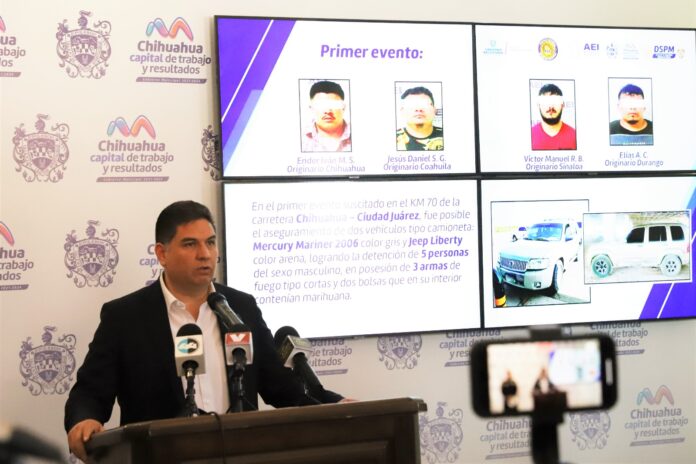 Entre los detenidos se encuentran dos hombres identificados como Elías A. C., oriundo de Durango, y un adolescente de 17 años de Ciudad Juárez, quienes viajaban en una camioneta Ford Mercury color gris y portaban armas de fuego y bolsas de marihuana.