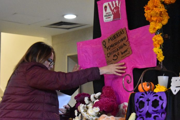 Chihuahua Chih (ADN / Adriana Saucedo) .- En dicho altar se habían colocado ya fotografías de familiares y ex trabajadores del legislativo, y este lunes las diputadas decidieron, colocar una cruz rosa con la leyenda “Muertas por feminicidio Estado de Chihuahua 5° lugar a nivel nacional”.