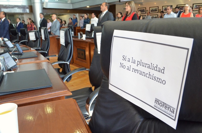 El día de hoy los lugares de los legisladores Miguel Ángel Colunga Martínez, Benjamín Carrera Chávez, Lourdes Valle Armendáriz, Leticia Ochoa Martínez, Gustavo De la Rosa Hickerson y Francisco Humberto Chávez lucieron vacíos, su lugar los ocupaba una pancarta en la que se podía leer: