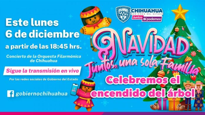 El Gobierno del Estado invita este lunes 6 de diciembre a seguir el tradicional encendido del pino navideño a través de redes sociales, para que los chihuahuenses de todo el estado sean parte de esta celebración y disfrutar la Navidad juntos una sola familia.