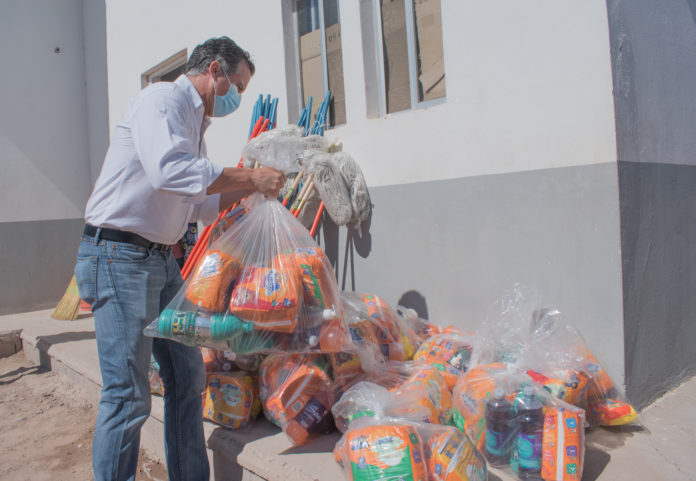 El secretario de Desarrollo Social indicó que cada paquete higiénico contiene jabón líquido, gel antibacterial, sobres de suero oral, cloro, limpiador líquido, trapeador, escoba, paquetes de pañales, toallitas húmedas y una cubeta de 20 litros.
