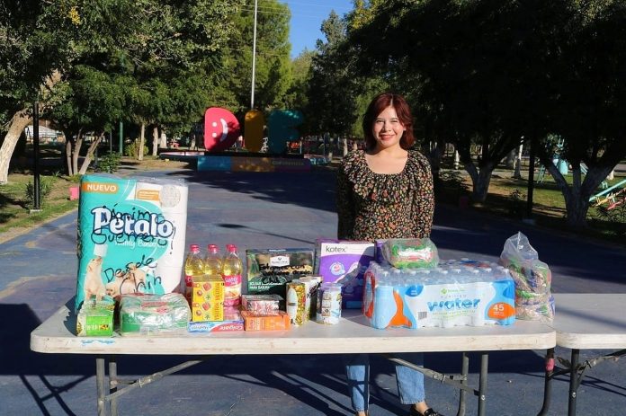 La entrega de la legisladora incluyó arroz, lentejas, frijol, agua embotellada, latas de atún y verduras, maizena, pure de tomate, aceite, toallas sanitarias, papel de baño y bolsas desechables. Además, invitó a los juarenses a hacer cualquier aportación.