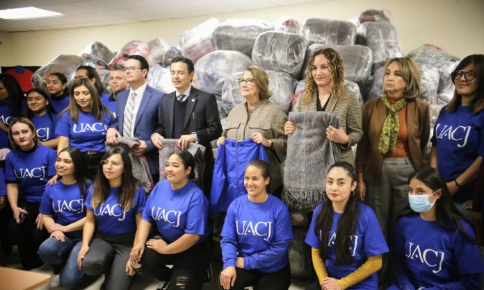Chihuahua, Chih .- Alumnos de los diferentes institutos de la Universidad Autónoma de Ciudad Juárez (UACJ), así como personal docente y administrativo, entregaron un donativo en prendas para la campaña “Juntos sin Frío” que lleva a cabo el DIF Estatal.