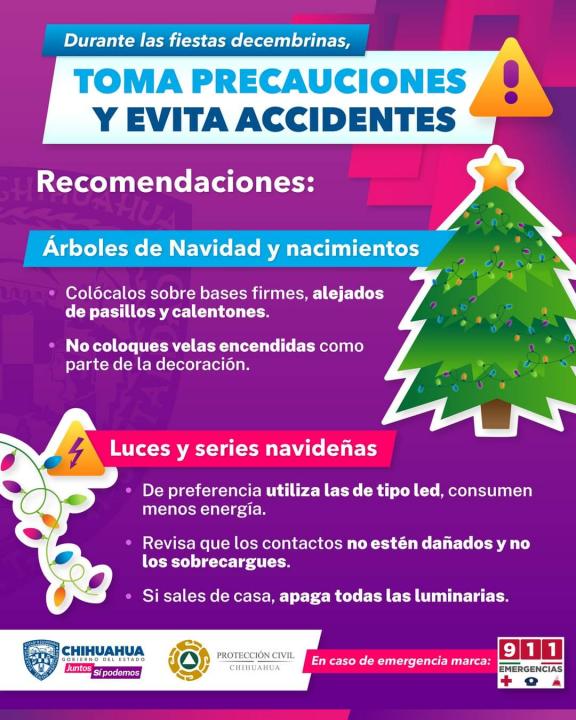Chihuahua, Chih .- A fin de evitar accidentes durante la temporada navideña, principalmente aquellos que involucran a menores de edad, Gobierno del Estado, a través de la Coordinación Estatal de Protección Civil (CEPC), dio a conocer una serie de recomendaciones a la población.