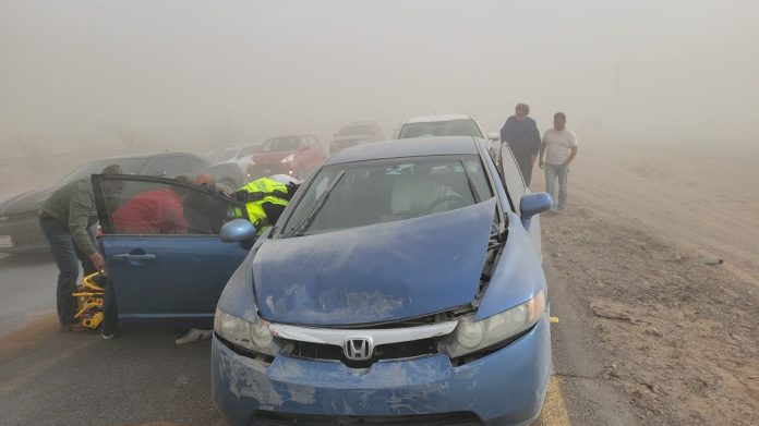 Ciudad Juárez, Chih. (ADN/Staff) – La Coordinación Estatal de Protección Civil (CEPC) ha lanzado una alerta urgente a los automovilistas que suelen transitar por la carretera que une Chihuahua con Ciudad Juárez, debido a la presencia de tolvaneras que han reducido significativamente la visibilidad en el área. Este fenómeno natural, potenciado por fuertes ráfagas de viento que azotan la región, ya ha provocado un accidente múltiple que involucra a seis vehículos y ha resultado en una persona herida.