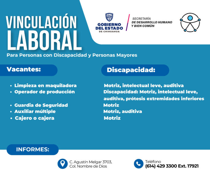 Chihuahua, Chih. (ADN/Staff) – El Departamento de Vinculación Laboral de Grupos Vulnerables de la Secretaría de Desarrollo Humano y Bien Común (SDHyBC) ha dado a conocer una excelente noticia para personas mayores o con discapacidad en busca de empleo. Diversas empresas inclusivas han abierto vacantes en sectores como la manufactura, seguridad, y servicios generales, con el objetivo de promover la inclusión laboral y brindar oportunidades de trabajo a quienes más lo necesitan.