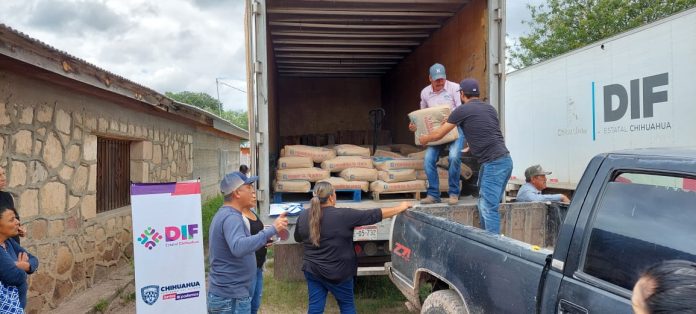 Chihuahua, Chih .- Con inversión de 360 mil 475 pesos, el DIF Estatal, a través de la Dirección de Alimentación y Desarrollo Comunitario, entregó a 34 familias que residen en la comunidad de Altamirano, municipio de Janos, diversos materiales de construcción para que lleven a cabo trabajos de enjarre y techumbre, cimentación, piso firme, y reforzamiento de muros.