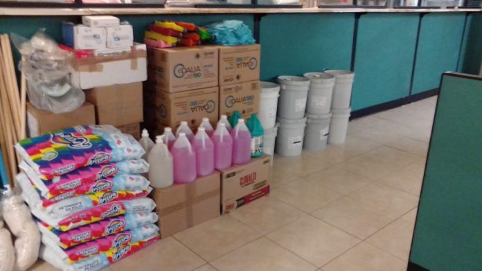 Los kits que se envían a cada plantel contienen diversos artículos de limpieza y sanitización como SON: gel antibacterial, jabón en polvo, jabón líquido para manos, cloro, microfibras, escobas, trapeadores, papel sanitario y cubetas sanitizantes.