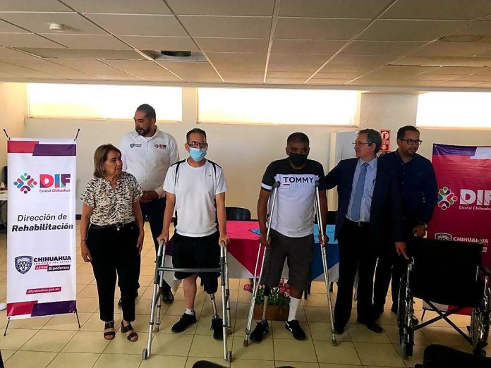 Ciudad Juárez, Chih .- El director general del DIF Estatal, Gabriel Eguiarte Fruns, junto al director de rehabilitación, Hiram Mendoza Rodríguez; la enlace del DIF Estatal en ciudad Juárez, Cecilia Andrade y el equipo de protesistas y ortesistas, entregaron aparatos de movilidad a sus solicitantes.