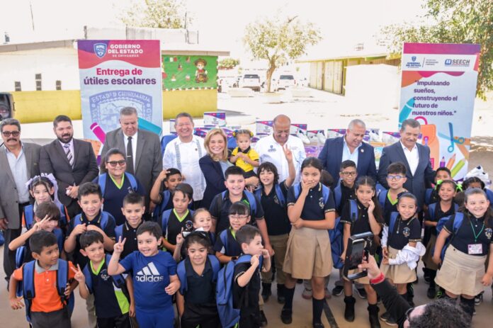 Como parte de las acciones para impulsar el desarrollo de las infancias, entregó de forma simbólica útiles escolares, mochilas y tenis, que apoyarán a la economía de las familias de las y los estudiantes en la frontera.