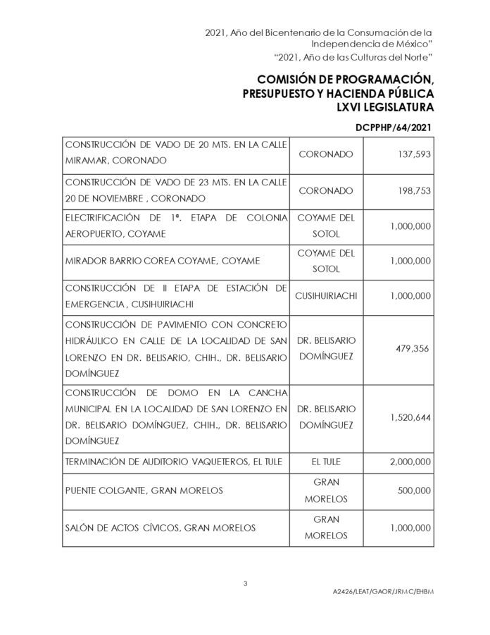 En el Anexo que forma parte del dictamen aprobado por la Comisión de Programación, Presupuesto y Hacienda Pública de la LXVI Legislatura del Congreso del Estado, se desglosan obras, monto de inversión, así como la adquisición de bienes.