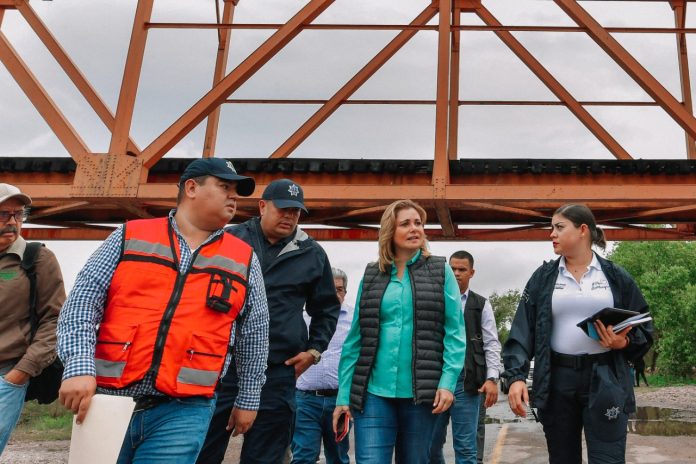 En compañía del secretario de Desarrollo Humano y Bien Común, Ignacio Galicia de Luna y la presidenta de Meoqui, Miriam Soto Ornelas; la Gobernadora visitó el puente de Congregación Ortíz; el paso provisional a la comunidad de Los Jáquez y el puente del poblado El Torreón, ubicados en territorio meoquense, donde por parte de la alcaldesa le fueron expuestos a la titular del ejecutivo, los hechos más relevantes en torno a la creciente del río San Pedro y el derrame de la presa “Las Vírgenes”.
