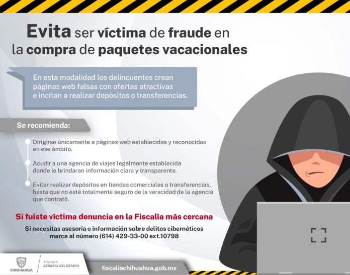 Chihuahua, Chih .- Ante la cercanía del periodo vacacional de Semana Santa, la Unidad Especializada en la Investigación de Delitos Patrimoniales de la Fiscalía de Distrito Zona Sur, emite recomendaciones a la ciudadanía contra el delito de fraude cometido a través de compras engañosas de supuestos paquetes vacacionales.